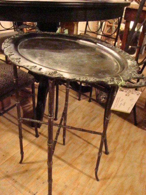 The patina on the tray, and the slender legs are lovely. This piece would be especially pretty on a covered porch.